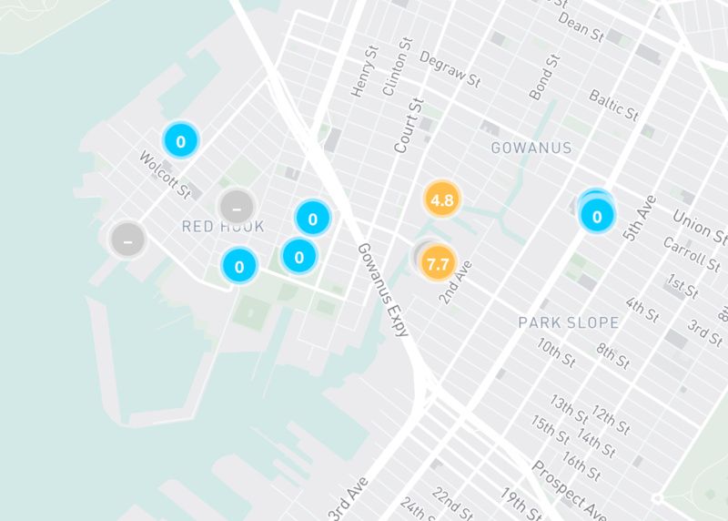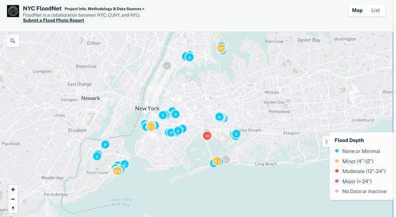Run by FloodNet, a “cooperative of communities, researchers, and New York City government agencies,” these sensors provide residents with real-time flooding information. The goal of the FloodNet Project is to better understand and prepare for flooding in New York City. Data collected by the sensors is shared on this interactive map, which updates live. The map shows the location of each sensor and the current flood depth at that location. At a quick glance, you can see how severe the flooding is by the color-coded key which ranges from “none” and “minor” to “major,” which is more than two feet. On Friday morning, parts of Brooklyn and Queens saw depths well over a foot.