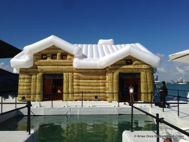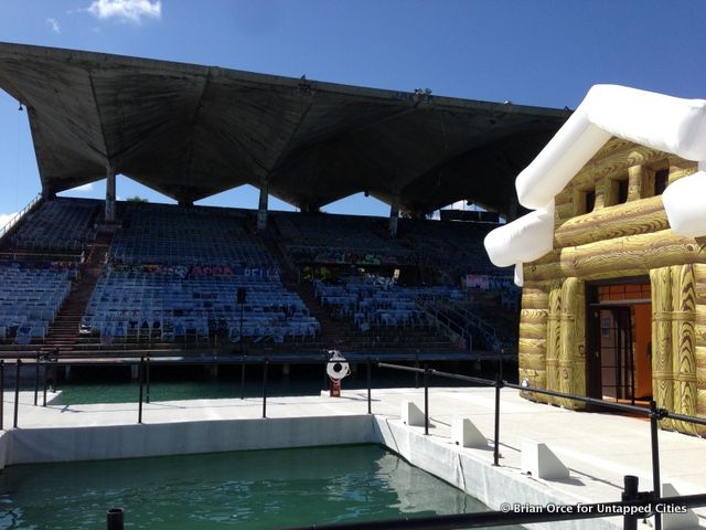 As you approach the abandoned Marine Stadium, you may think you’ve come to the wrong place until you spot waiters clad in white darting to and from a wooden dock. Through the trees one can make out a ski chalet floating on what looks like a snow covered island.