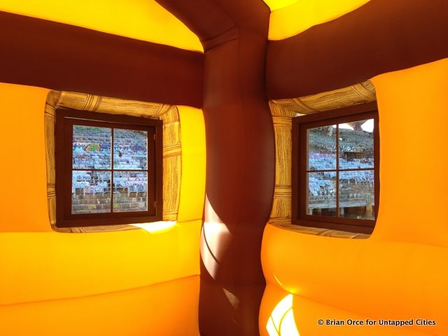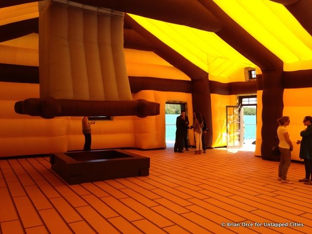 On closer inspection, though, the exhibit is no less strange. The snow is white astroturf of some kind and the chalet is a meticulously detailed inflatable castle complete with a grand “fireplace” glowing red in the center.