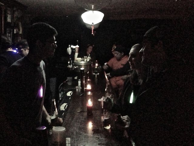 As we walked deeper into the abyss, however, we happened upon a storefront that appeared to have several candles burning within. A closer view revealed a small group of people crowded around a small, bright light in the back of a bar. We shined a light on the chalkboard, which claimed the bar, Professor Thom’s, was open. We couldn’t resist.