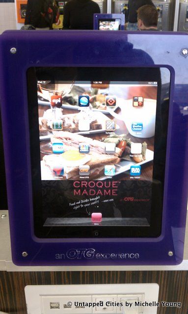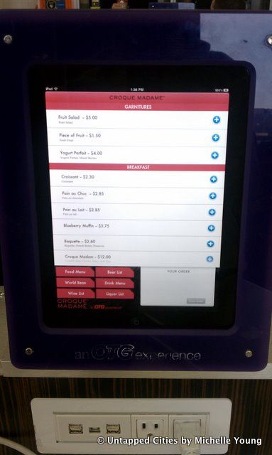 Delta Terminal 2 at JFK just got a badly needed makeover. A cafe called Croque Madame has wallpapered the walls with a fleur-de-lis like pattern and new tables of varying configurations (personal, two-fers and communal bars) that come equipped with an iPad, two power outlets, four USB ports, a firewire port and leather seats .The iPad is internet ready comes with Safari, Google Earth, games, news (CNBC and USA Today), weather and WebMD. You can also download apps! You can also order food and drink from the iPad and it will be served to you.