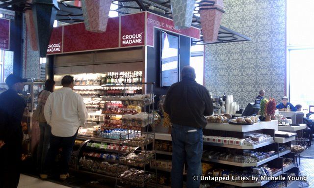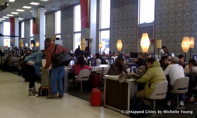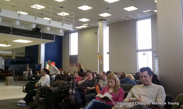So far, there’s been only one review on Yelp but it’s glowing. The user reports an “extensive” and “well-rounded” list of beer and wines (starting at $10), sweet and savory crepes for $7.50, sandwiches from $8.75 to $12. The user was upset that non-cafe customers were sitting in the seats, but I liked the non-discriminatory policy because frankly it was far nicer than the rest of the terminal which is pretty nasty (see below). Furthermore, the seating style extends far beyond the cafe into other gate areas and is part of a larger airport strategy. OTG Management has installed the iPads in Bar Brace restaurant in Terminal 3 as well. It has also been reported that OTG has plans to replicate the idea in LaGuardia airport.