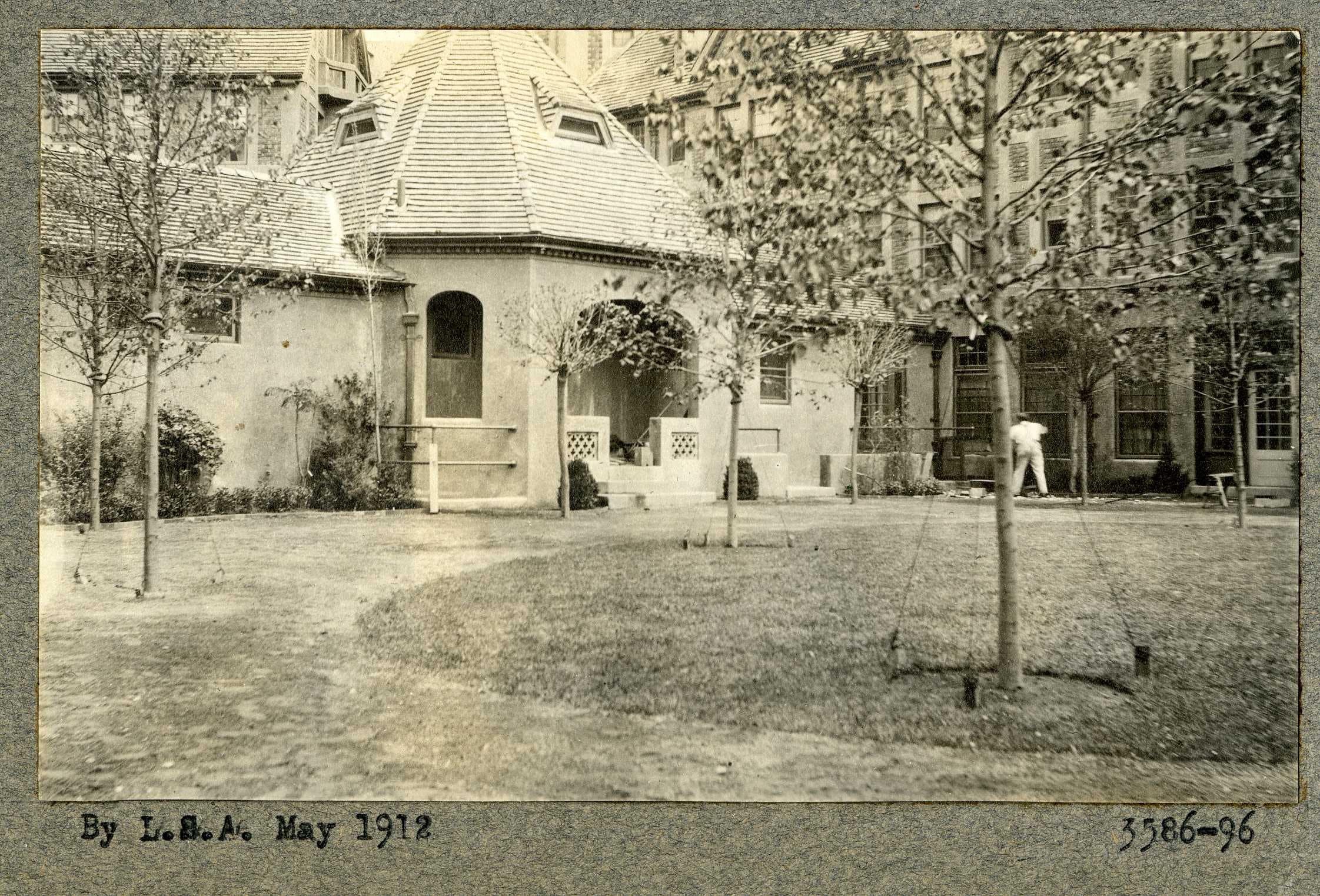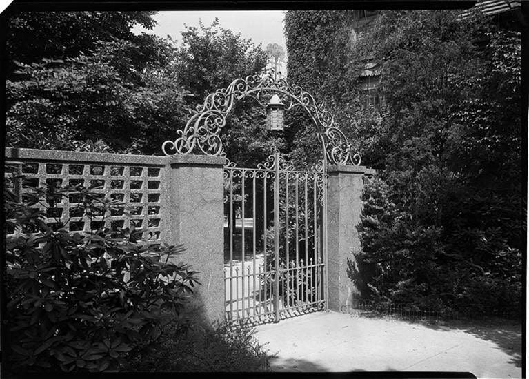 A few early features are still intact, though a few vanished. Adjacent to the Tea Garden was an archway and pergola that led to tennis and squash courts; the land became valuable, and in accordance with the architectural standards of the Forest Hills Gardens, the Forest Hills Inn Apartments was designed as an annex over the original tennis courts, so a portion of the Tea Garden was eliminated in the 1930s. The cascading fountain that flowed into a pool, which featured sculptures of iguanas, vanished. The central brick fountain still stands but is non-operational, and its piping needs to be fixed and its breaks must be weatherproof power washed. The original ornate gate still features a small logo of F’s facing forward and backward with a tree motif above them.