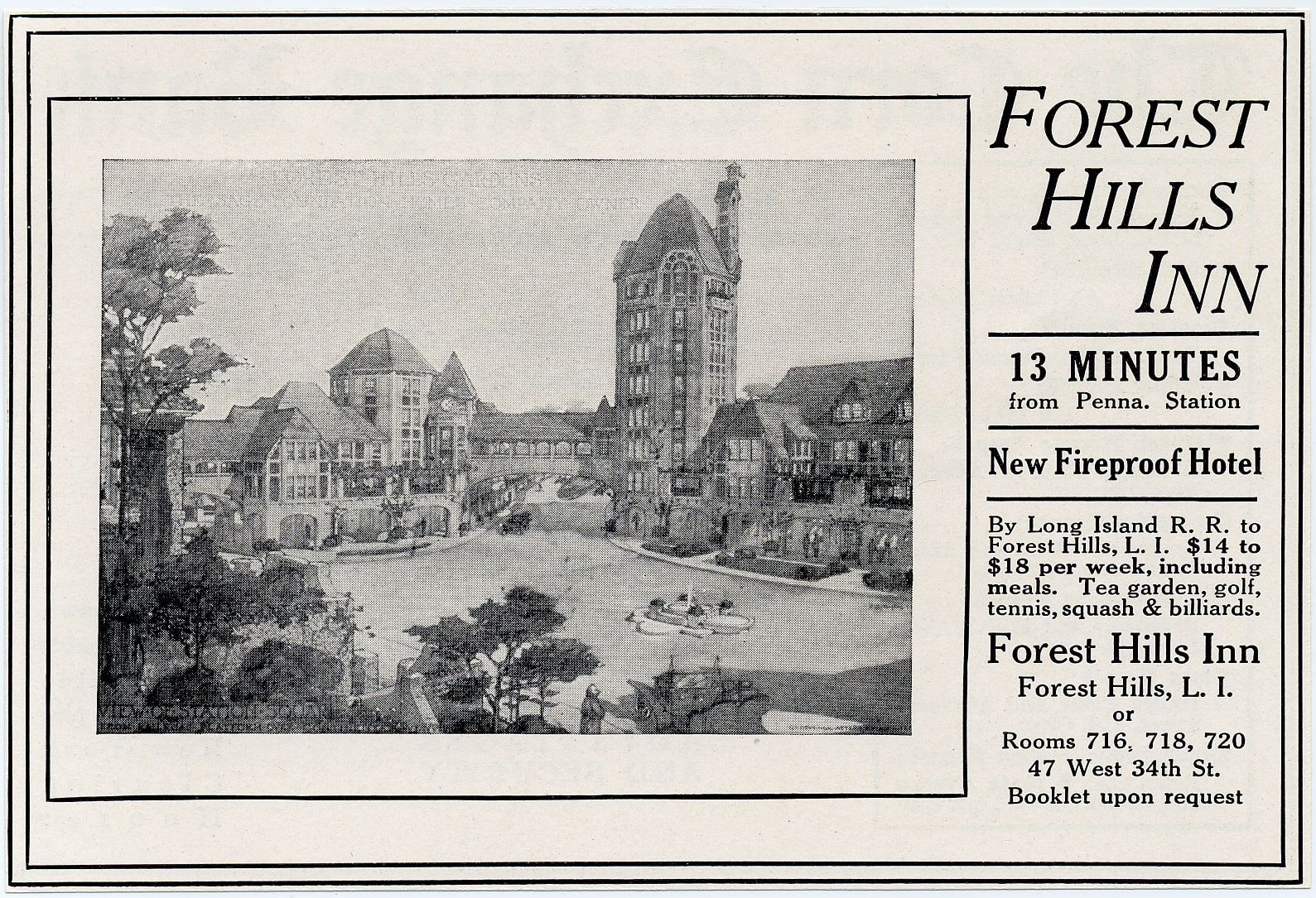 A 1924 edition of The Forest Hills Bulletin read, “The Tea Garden of the Forest Hills Inn is a veritable fairyland, when lighted with Japanese lanterns, with the trickling fountain heard in the background, and a new moon shining overhead. There is no more delightful place in Greater New York for one to spend the dinner hour.”