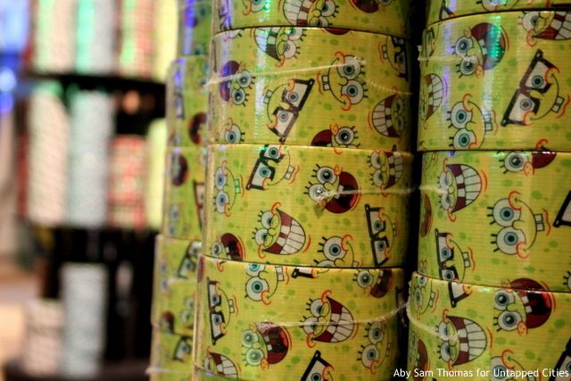 Walking into the Duck Tape brand duct tape pop-up store was like walking into a riot of color—I couldn’t find any of the drab silver tape I was familiar with in this space. Instead, the rolls of tape here were available in an assortment of colors and patterns. The variety was rather amazing—there was tape covered with everything from gleeful flying pigs to a rather sullen-looking Justin Bieber, Hello Kitty to Sponge Bob Square-Pants, and much, much more.