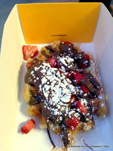 The truck serves two types of wafels: the fluffy Brussels wafel, and denser, butterier liege wafel (above).
