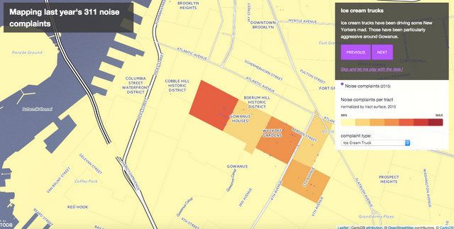 The CartoDB team was particularly interested in noise complaints, because as they say, it is a category that “cannot be realistically measured everywhere with sensors.” Thus, noise is measured subjectively and in New York City, may be the only widely available data source. More than just location, the 311 data also lets you know the type of complaint. For example, music complaints are common in Harlem and Inwood, though we personally love the vibrancy of street life in these neighborhoods. Ice cream trucks are a particular offender, and particularly in Gowanus (!). Comparison metrics include time of day, neighborhood, season, construction permits, and others.