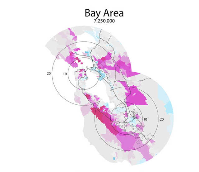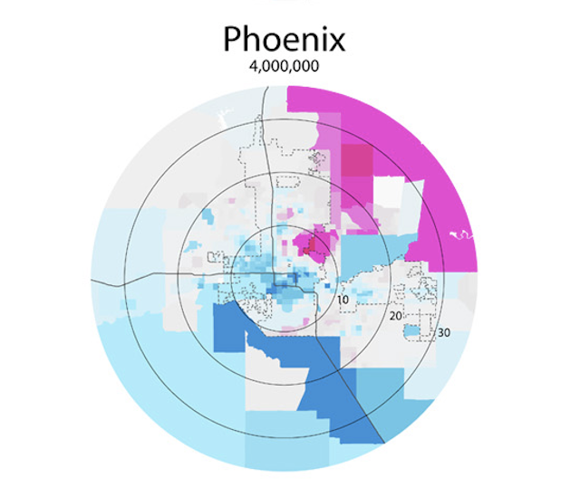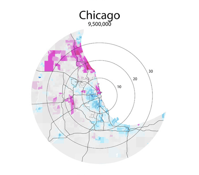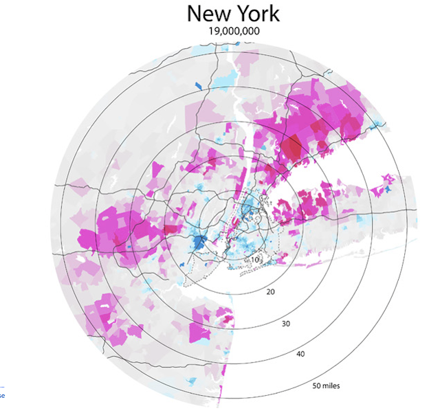 This map series by Bill Rankin tests the “donut” hypothesis: “the idea that a city will create concentric rings of wealth and poverty, with the rich both in the suburbs and in the ‘revitalized’ downtown, and the poor stuck in between.” Rankin mapped the 25 largest metropolitan areas in the US (populations over 2,000,000). This first map of New York City and the surrounding metropolitan area reflect this pattern to a T.