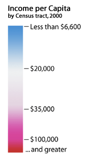 But these maps use data from the 2000 census and do not reflect current patterns as they are, especially since so many cities are seeing gentrification, the poor pushed to the suburbs, and such a blurring of the city-suburb line, and the proliferation of subdivisions and edge cities. Speculating about how the colors may have shifted around is what makes these maps so fun to revisit.