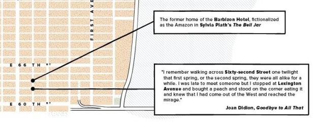 On Lexington Avenue and 63rd Street, the former Barbizon Hotel (check out our vintage photos!) made the map’s list of locations. Today the building has been repurposed for condos, but between 1940-1960, illustrious guests such as Joan Crawford, Grace Kelly, and Liza Minelli could be encountered in the hotel’s banquet halls and bedrooms. On a summer evening in 1953, Sylvia Plath was seen throwing her entire wardrobe out her hotel room window during a drunken tantrum. The hotel later served as inspiration for her novel The Bell Jar. Check out our article The Landmarked Barbizon Hotel on the Upper East Side of NYC, Famous for its Glamorous Clientele for more on the fascinating history of the hotel.
