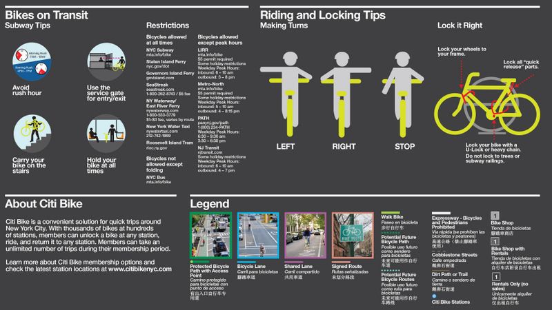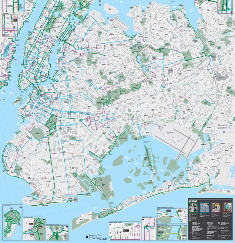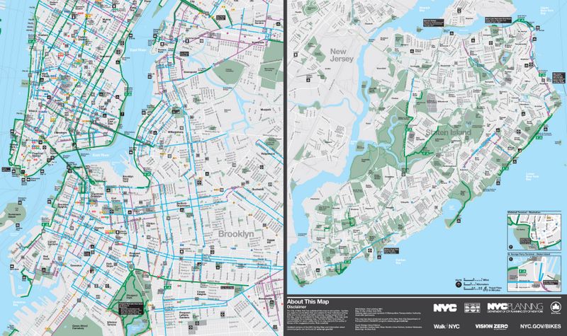 The New York City Department of Transportation has released its annual bike map, both digitally and with a circulation of 375,00 hard copies that will go in bike shops, libraries and schools throughout the five boroughs. Gothamist reports that the map has 70 miles of new or upgraded bike lanes and that the DOT has promised 15 new miles to come this year. The map also comes with a list of bike shops, biking tips, and a legend that shows different types of bike lanes (protected, shared, and more), as well as the location of Citi Bike docks.