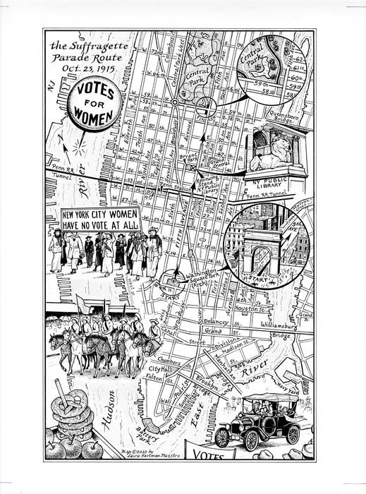 The suffrage parade of 1915 marched from the Washington Square Arch, north up Fith Avenue past the New York Public Library on 42nd Street where there was a reviewing stand, and continued on to the corner of Central Park at 59th Street. The three-mile parade route is illustrated in the book by Laura Hartman Maestro. In the illustration, Maestro depicts scenes from the parade and famous New York City landmarks along the route. We see a group of suffragettes carrying a banner that reads “New York City Women Have No Vote at All,” depictions of the library’s famous lion statues, a group of suffragettes on horseback, and a street cart full of pretzels and apples. Other New York City landmarks including the Manhattan and Brooklyn Bridges, City Hall and Grand Central Terminal. You can also the Pennsylvania Railroad Tunnel which crosses under the East and Hudson Rivers.