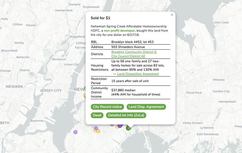 To use the map and view the details of each sale, click on the various dots, which have been color-coded according to whether the lots were bought by a for profit or a non-profit developer. 596 Acres conveniently hyperlinks the contact sheet for the local Council Members, which users can access by clicking on the “City Council District” link. The sections titled “Housing Restrictions” and “Community District Income” also give an idea of how useful the sale may be to locals.