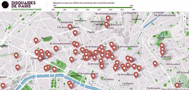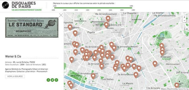 Paris was once at the forefront of the music industry and dotted with phonographic shops. The project Disquaires de Paris has created an impressive interactive map with archival material documenting 120 years of sound recording, all locations which are no longer in existence today. The list includes retail shops that sold recordings (what we traditionally would think of as a record store), stores that sold phonographic cylinders and other methods of recording (which appeared in the city starting in the 1890s), as well as luthiers who who were among the first to get on board with sound recording.