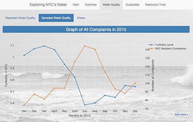 New York City’s drinking water is one of the best in the country, but it doesn’t mean that issues don’t occur. After all, some parts of the water system are 174 years old, with the Croton Aqueduct completed in 1842. This week, Columbia University statistics professor Tian Zheng shared her students’ exploration of New York City’s water complaints via Twitter. The online app created by students Schinria Islam, Richard Wang, and Josh Dillon addresses many aspects of water quality issues, with the home page a “complaint” cloud from comments ranging from “I’m sick because of my water,” to “My water got turned off.” There are maps, charts and graphs that track the location and type of complaints by year and by borough.