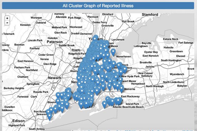 In the interactive map, reported illnesses are mapped and can be clicked to reveal address of complaint:
