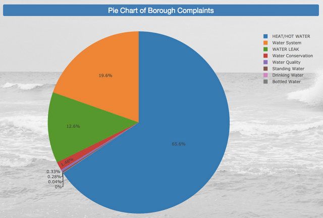 The data in the app can be viewed over three years, 2013 to 2015. In Manhattan in 2015, over 72% of complaints had to do with heat and hot water delivery. 17% of complaints were related to the water system itself, and a little over 9% were related to leaks: