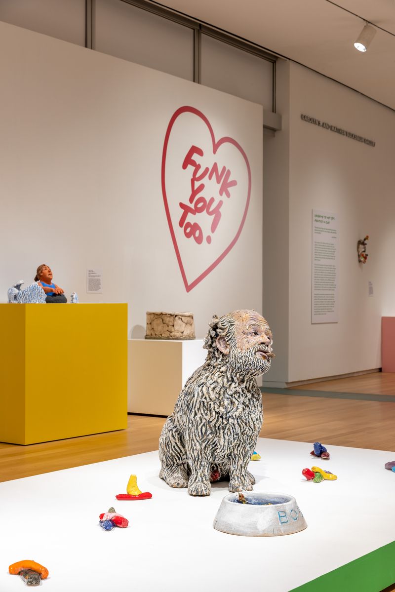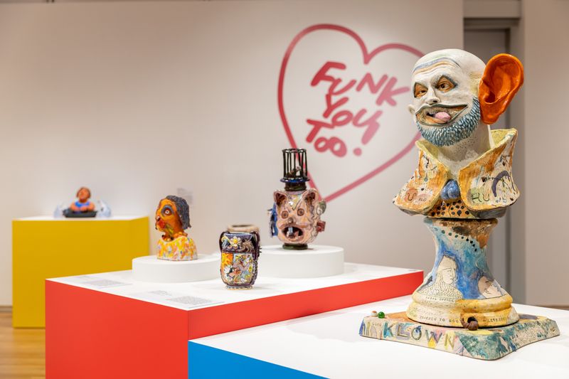 The Funk Art movement began on the West Coast in the 1960s. It sprang from a group of artists who shared anti-establishment views of what makes “good art.” These artists found new ways to use clay and sculpture as a tool of f critique and satire. In the exhibit, visitors will see works by some of the earliest Funk Art creators such as Robert Arneson, Viola Frey, Patti Warashina, and Howard Kottler.