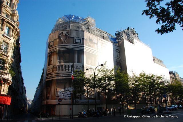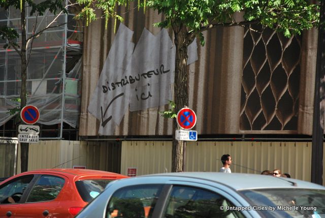 We love this scaffolding on Boulevard des Italiens for the bank LCL, a tromp l’oeil in a way but with a quirky bent. Designed like a cardboard architectural model with Sharpie markings, it even points out where the cash machine will be located eventually. Turns out it’s by Athem, the same team who did the melting facade back in 2007. For a great lunch, stop by Le Paradis du Fruit nearby for smoothies and salads au natural.