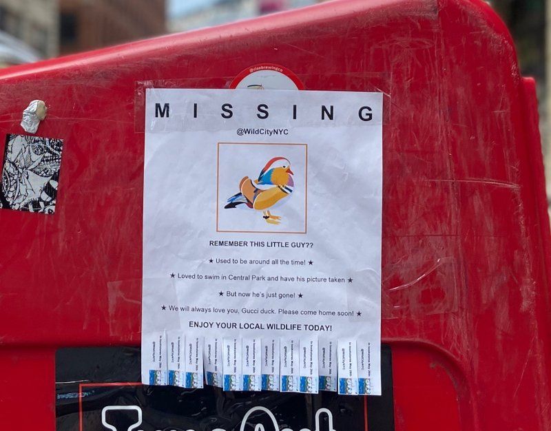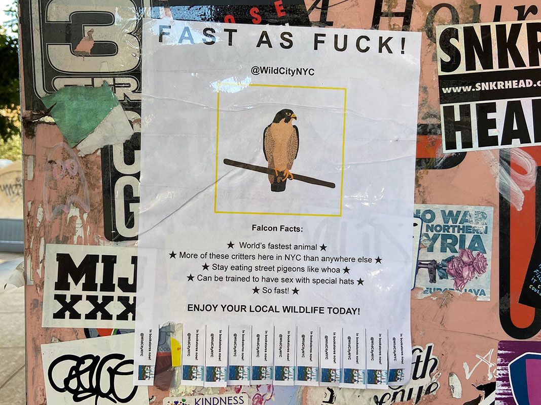 Have you spotted any of these funny, guerrilla PSAs about New York City’s wildlife? “MISSING” says one in connection to the Central Park Mandarin Duck. “FAST AS F*CK” says one about the falcon. “LEARN TO BIRD” with no money down! In homage to the DIY advertisements you might find on telephone poles and newspaper boxes, the informational flyers have stripes on the bottom you can rip off for more information. These reveal the source of the humorous PSAs: It’s from the author of Wild City: A History of New York City in 40 Animals, Tom Hynes.