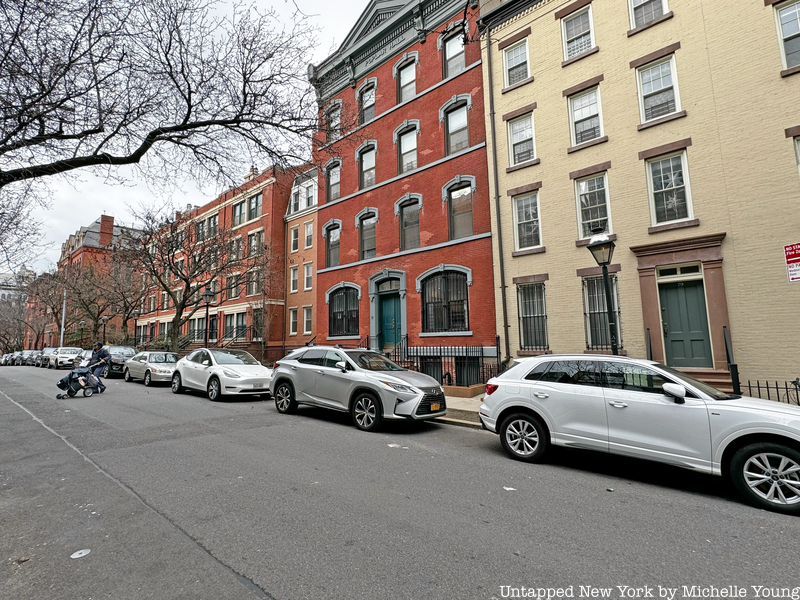 You can see from 1940s tax photos that ornate electric lights in the Mast-Arm style once lined the street. That style was introduced in 1908 and re-introduced in the late 19th century as the Type M post. Standard octagonal poles later replaced the Type M posts and still stand amongst the gas lamps in Brooklyn Heights today. New construction replaced the building shown in the image above at 69 Poplar Street. The corner building pictured on Hicks Street still stands.