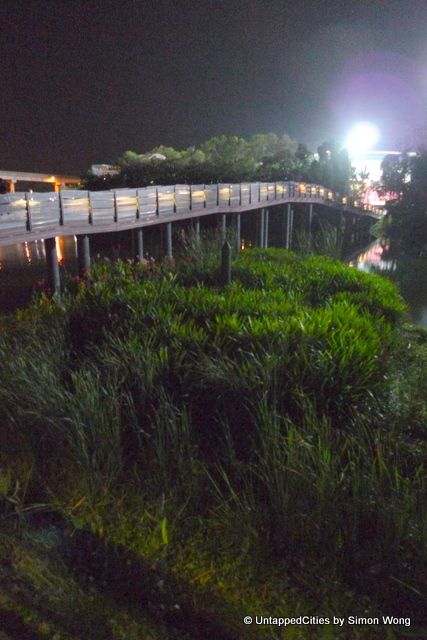 Upon arriving at Sengkang Riverside Park, closely situated were the ubiquitous conveniences of a community centre. I grabbed a couple of beers from the 7-11 and strolled down to the riverside where there were plenty spaces to loaf. A timber decked platform, a series of long boardwalks snaking across the river, and quiet grassland on the other side are nicely lit up at night.