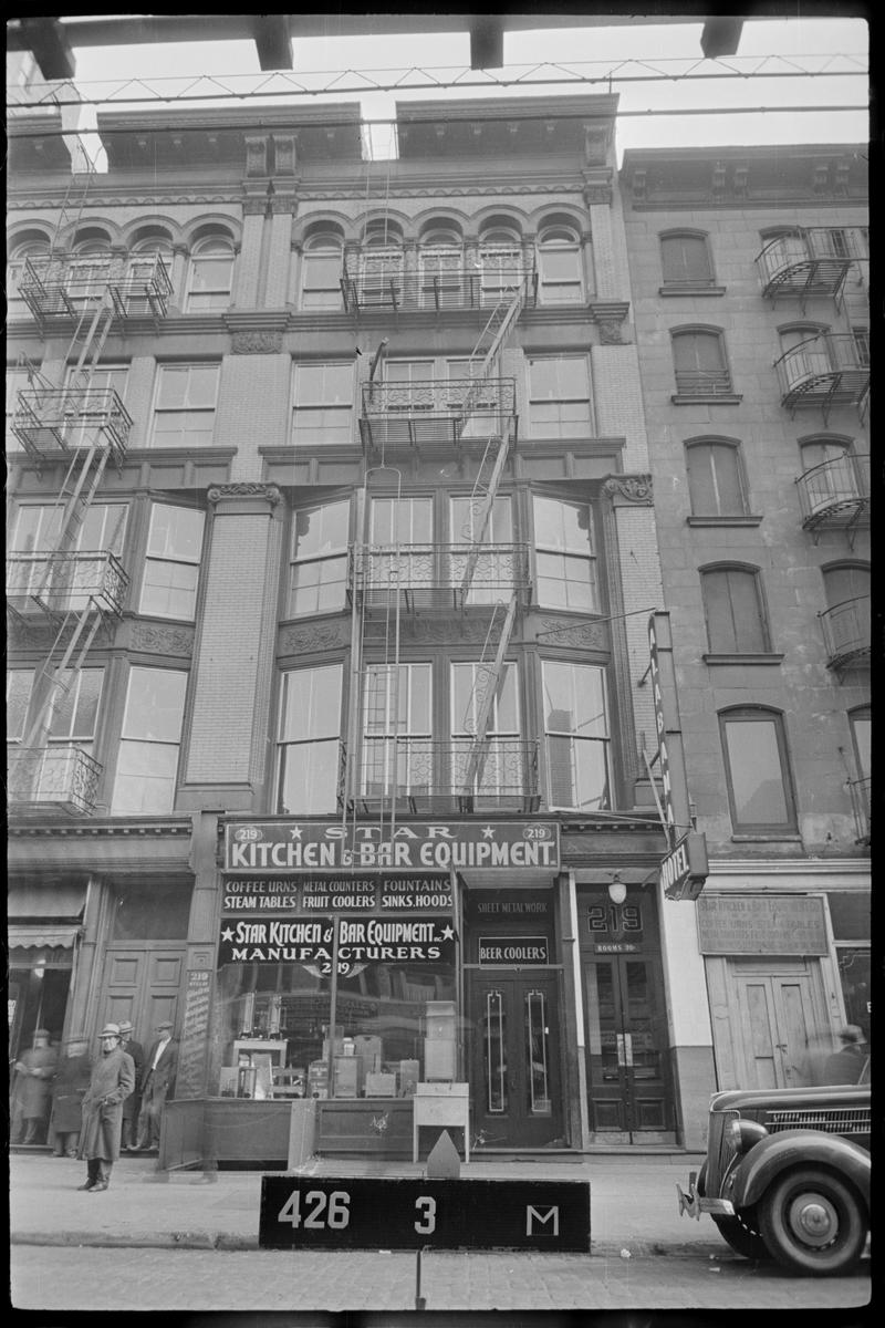 The ghost sign you can see today is visible in a 1940 tax photo. At the time, the storefront at 219 Bowery was occupied by Star Kitchen & Bar Equipment. In the old photo, the sign reads, “Coffee urns” and “steam tables” as it does today, but you can also see what was once written in the central window, “Metal Counters,” “Fruit Coolers,” and the third panel once read “Fountains” and “Sink Hoods.” Those last two were changed at some point to “Sinks & Drainboards,” and “Bar Benches” as it reads today.