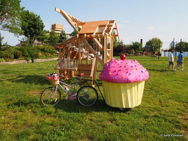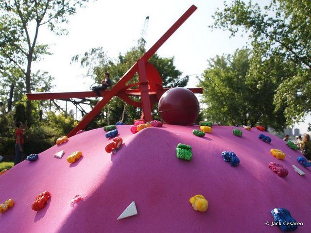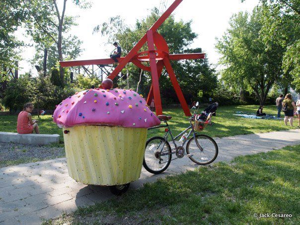 Socrates Sculpture Park in Long Island City, Queens is the only park in New York dedicated to sculpture–specifically large-scale sculpture. What better place then for Jack Cesareo to bring his Giant Cupcake. Set against the backdrop of the Manhattan skyline, the cupcake seemed right at home. As covered in an Untapped interview with Jack (who’s an artist with the Museum of Natural History), the giant cupcake is an art project, often photographed against iconic architecture in New York City.