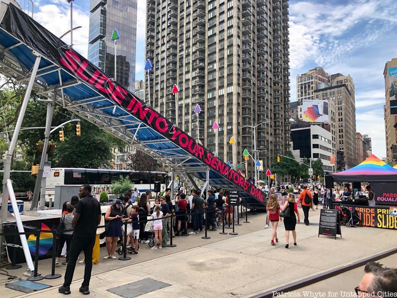 Pride flags and rainbow themed art installations have popped up all over New York City this month and the latest interactive installation is inspiring New Yorkers to take political action. Tinder, the popular dating app, unveiled the 30-foot tall “Pride Slide” today in Flatiron Plaza, by Madison Square Park on East 23rd Street, as a kick-off to World PRIDE celebrations and Pride Week. The slide, which is up for one day only, represents more than just a play on words.