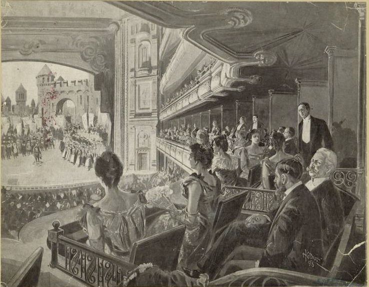 It is fitting that the Metropolitan Opera House would exceed the Academy of Music in many ways. The New York Times commented on the Academy of Music’s acoustics stating, “the tone of their voices sometimes went astray in the…auditorium”. Yet the smallest note of music could be heard in the Met’s sold-out theatre. Equally important, the Met surpassed the Academy in luxury with 122 opera boxes. The building, which had the largest proscenium in America, was designed architect J. Cleveland Cady, with gold interiors by renown designers Carrere & Hastings. By Showcasing the jewelry and lavish clothes, the glamorous boxes allowed their owners to see and be seen. Because of this opulence, the balconies earned the nickname “Golden Horseshoe.” Accordingly, the combination of the sumptuous design and superior sound impressed the patrons and press. At the end of opening night, the Metropolitan Opera house was declared a triumph.