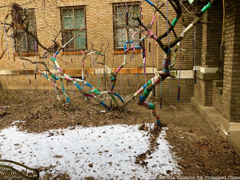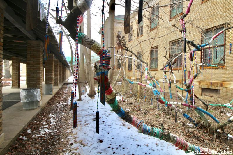 Yarn wound around a tree with beaded ropes hanging from the branches right in front of the entrance.