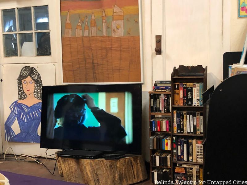 The Living Museum documentary plays on a television during visiting hours next to a collection of VHS tapes.