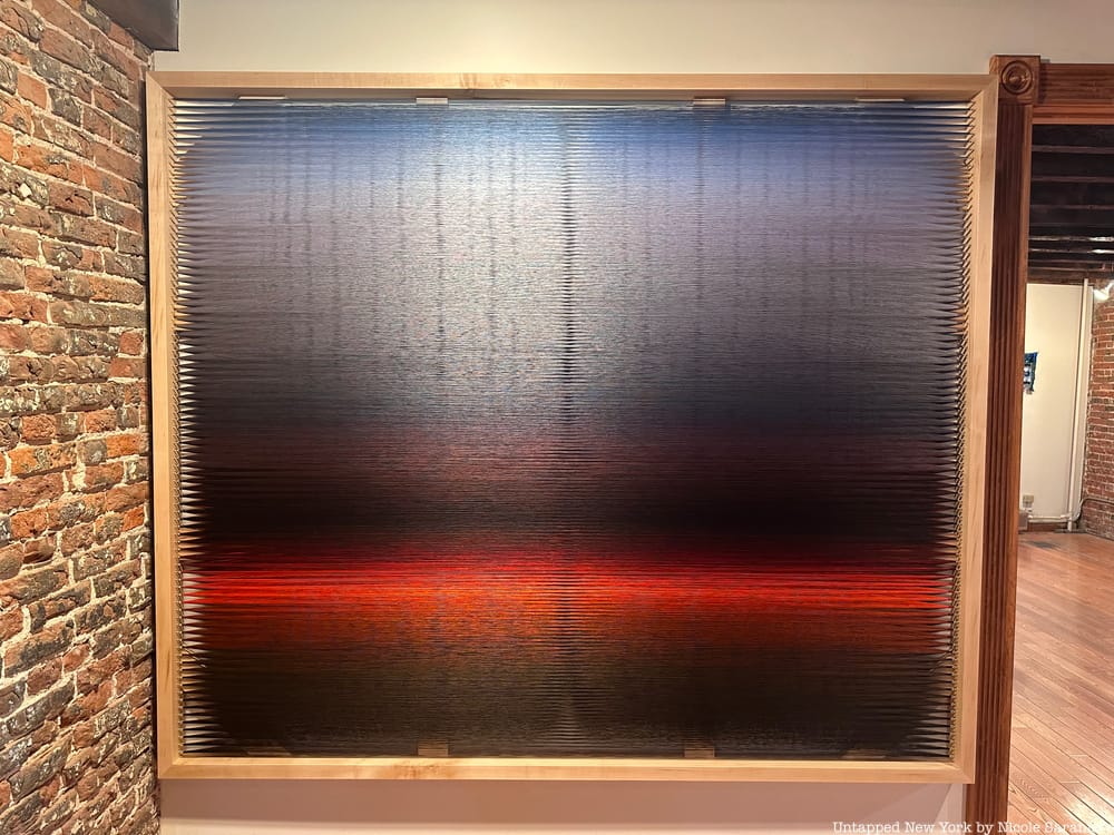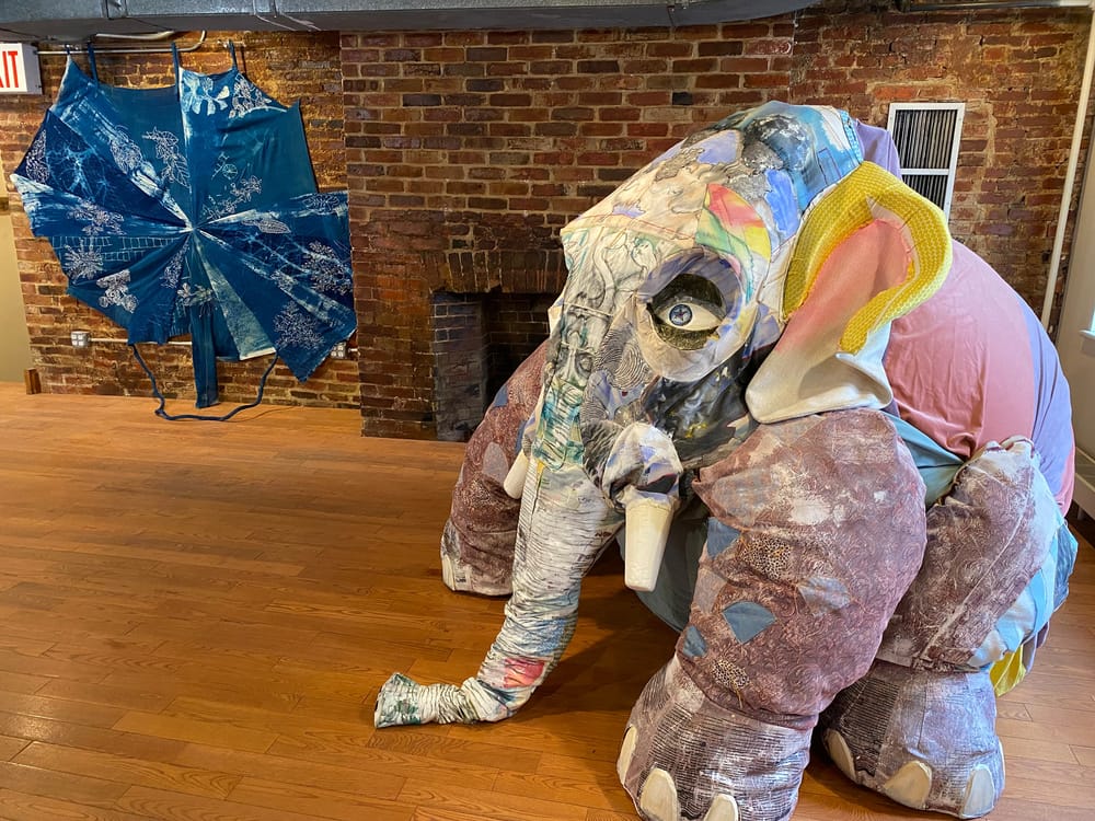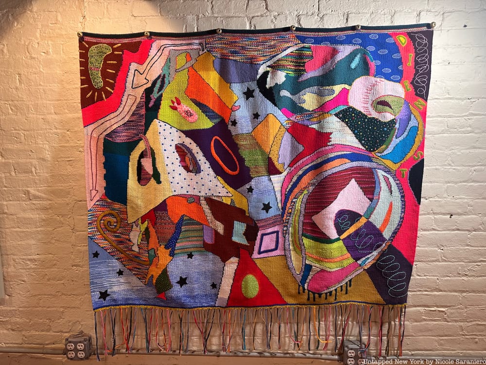 Among these original architectural elements, visitors to Golden Thread 2 will see dazzling works of art that incorporate embroidery, stitching, quilting, sewing, and crocheting, among many other textile mediums. Crafted by a diverse array of artists thoughtfully chosen by gallerists and curators Karin Bravin and John Post Lee, longtime New Yorkers and textile art masters, many of the pieces on display engage directly with the building.