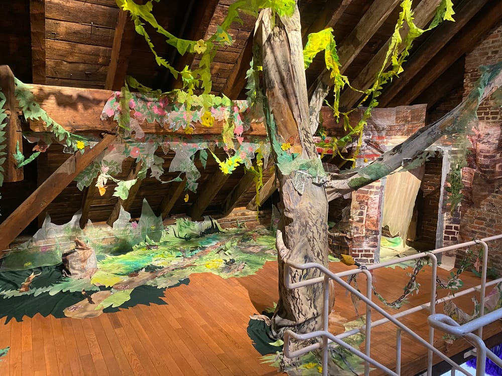A more overt interaction between the building and the art can be found on the top floor, where Tura Oliveira incorporates the massive 18th-century grain hoist into Wheel of Fortune (2025). The work is comprised of a limp, humanoid figure made of reclaimed textiles, cyanotype on hand-dyed silk, piping, and yarn, tangled within the spokes of the wheel. With a title that plays on the name of a tarot card and the popular TV game show, this work reflects on the premise of history turning like a great wheel, catching us in its spokes.