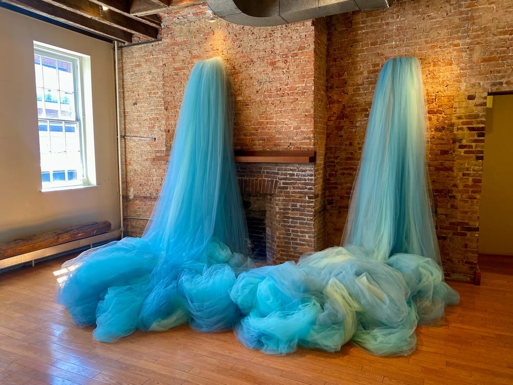 Ana MarĆa Hernando's stunning El intento del agua/The Intent of Water (2025)ācomprised of two voluminous arrangements of tulle, felt, and velvet in various hues of blue, white, and greenāappears to be flowing straight out of the building's brick walls as two waterfalls.
