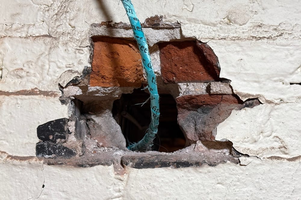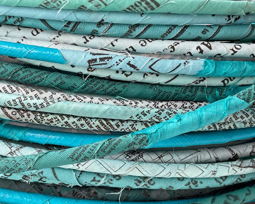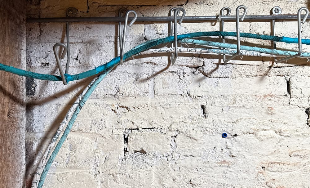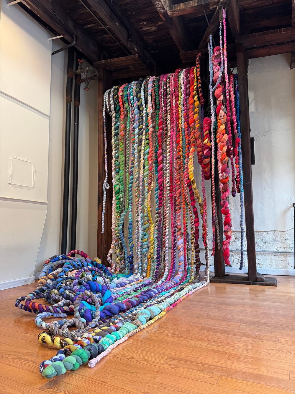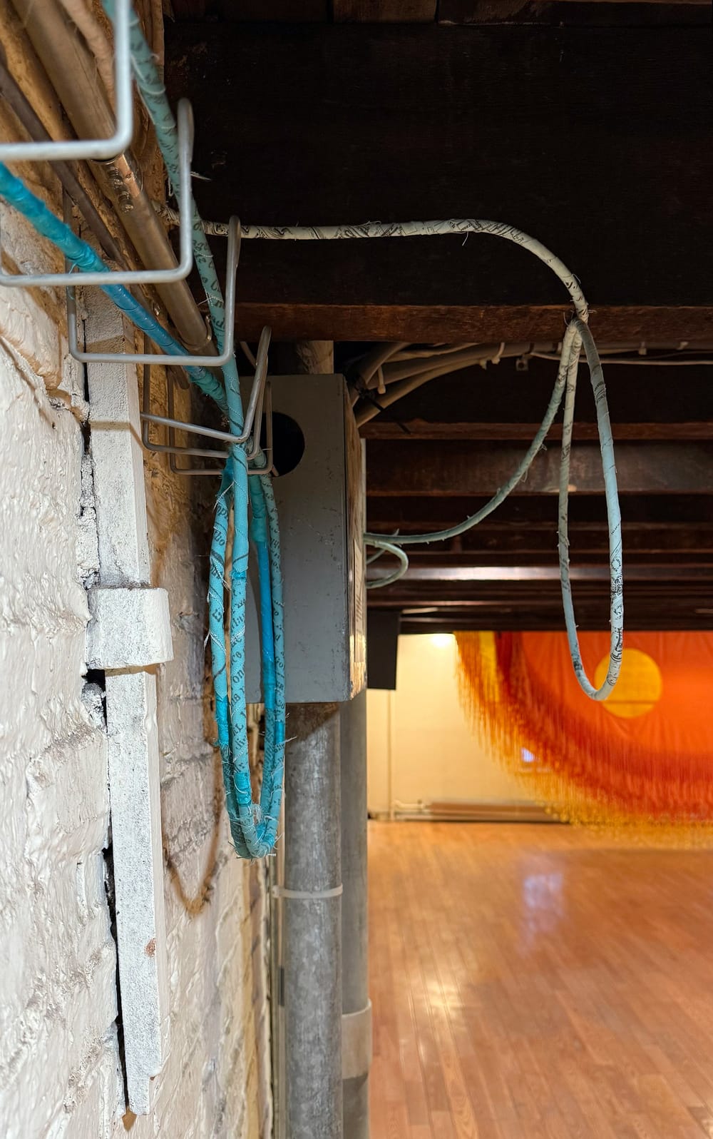 If you're not paying attention, you may miss Jess Blaustein's Transmission 36-44919 (2025). This subtle piece, crafted specifically for the site, channels the past lives of 207 Front Street. Elements of archival research on the historic building and the South Street Seaport appear on cloth scraps and plastic tarp that wrap around roughly 300 linear feet of discarded coaxial cable snaking through the building.