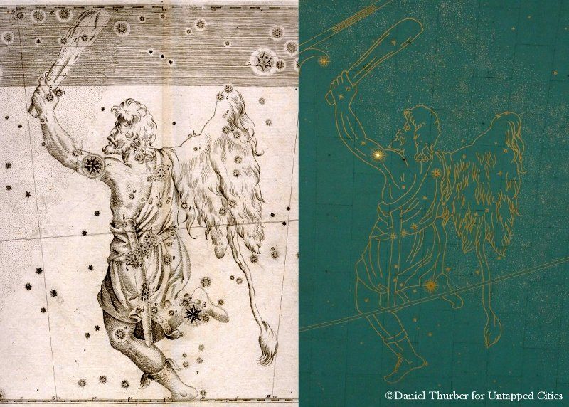 Orion as he appears in the ‘Uranometria’ versus the Grand Central mural. ‘Uranometria’ image from Wikicommons, courtesy of the United States Naval Observatory Library