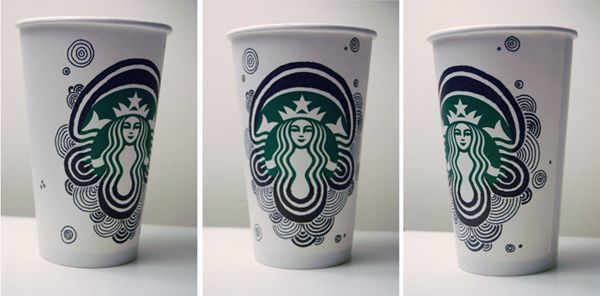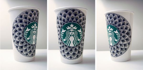 During one of these extra pump days my procrastination set in and my empty grande Starbucks cup sat there, taunting me, asking me to doodle on it. Once my Sharpie marker joined in on the taunting, I couldn’t resist. So much open white space! The clean circle with the green and white scales reaching the edge of the logo just begged to be connected, extended and twisted. I gave in and my Starbucks project was born. I don’t get a chai tea every day, so i can take my time and make sure each cup is it’s own little masterpiece.