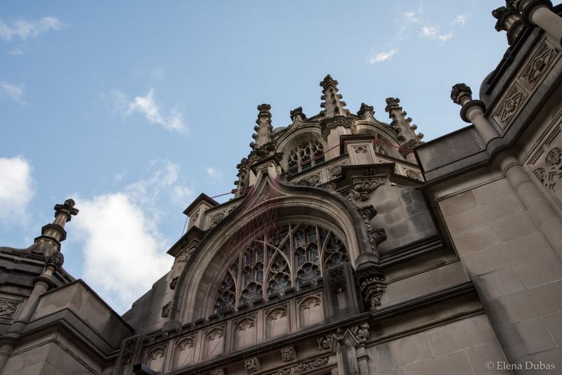 In the chapel, the parachute cords are arranged to highlight the geometry of the beautiful chapel, bringing attention to the Gothic ornamentation of the church from the structural details like door frames to the spectacular dome, and religious elements like the pipe organ. On the exterior, the cords criss cross in front of a stained glass window.