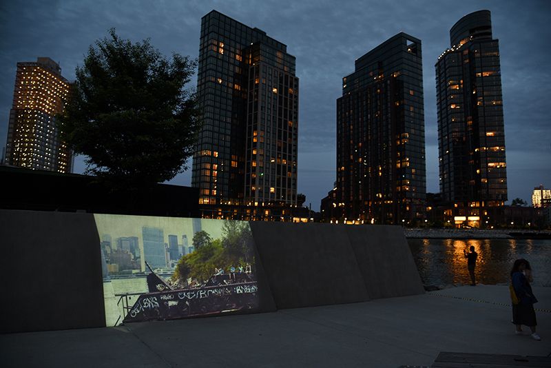 In 2015, Untapped New York accompanied the Chance Ecologies team, which includes artists and documentarians Nathan Kensinger and Nate Dorr, on an exploration of Hunters Point South, then one of the last accidental waterfront spaces along the New York City waterfront. Kensinger and Dorr invited twenty artists to respond to the site before it was demolished. In the eight years since, we have watched the site transform into a world-class climate resistant park and have brought our Untapped New York Insider members on multiple tours of the space with NYC Parks staff as well as with the principal architects of the project, Thomas Balsey and Michael Manfredi. Now, we’ve come full circle with a site-specific video installation called “Ground Reclaimed” by Kensinger and Dorr over the weekend, projected onto Hunter’s Point South kayak launch..