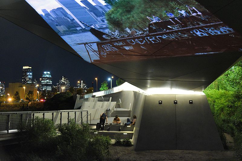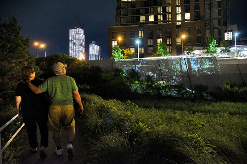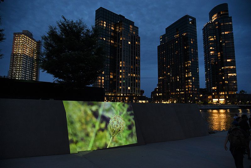 The latest installation along the Queens waterfront layers three videos of the landscapes that were lost onto the new construction, be it towers, walls or man-made structures. As Kensinger describes, “The pieces invited viewers to walk through the woodlands and wildflower meadows that lived here just seven years ago. ” The film Reclaimed Ground was projected onto the park’s kayak launch, alongside works by other artists, part of Creekworthy, a summer-long art event curated by the Flux Factory that will also explore Newtown Creek. Flux Factory’s new art space will be located inside one of the towers in Hunter’s Point South, another part of the loop of development that has been going on here for nearly a decade.