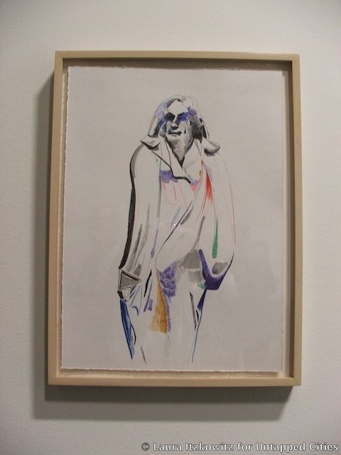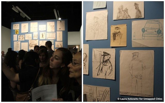 The artworks on display at last night’s opening at The Kitchen were my favorite kind– works that reveal themselves layer by layer. Upon first glance, you might think, that looks nice, or that looks interesting, or even the opposite. Right by the entrance on the second floor, there was a collection of umbrellas arranged on a rack and a drawing of Rodin’s Balzac sculpture. Moving into the main space, I observed a collection of works ranging from drawings to sculpture to video art. As I did my first lap of the gallery, I stopped in front of a collection of charcoal drawings of NYPD officers that looked like they had been drawn in a college art class and wondered how something so unfinished ended up in a gallery in Chelsea. I wondered the same thing about a collection on the opposite wall of pen drawings that looked like badly drawn street maps. It would be a shame to stop there, relying only on first impressions, however. The stories behind these works of art are much more interesting than they initially appear.