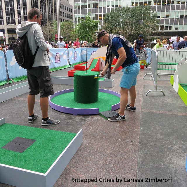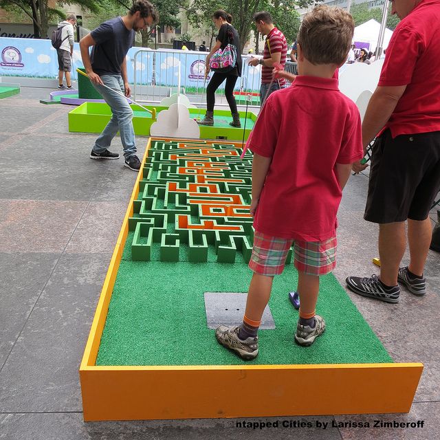 Further up in Manhattan, at 52nd Street and Park Avenue, is a mini-golf course called “The Course of Emotions,” an interactive golf course with holes named after human pain, like worry, frustration and despair. Designed by artist Risa Puno, the small square-shaped course is full of difficult putting opportunities, like rolling the ball up a vertical wall of AstroTurf or navigating through a mouse-worthy maze. You can sign up for a time slot and then go wander the rest of Summer Streets while waiting for your chance at emotional upheaval.