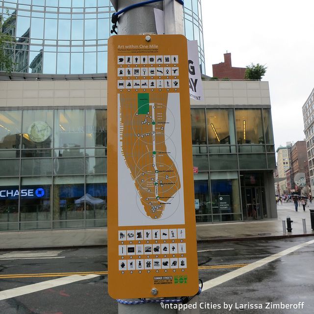 Sprinkled liberally with museums, New York City is also host to countless outdoor sculptures. Artist Bundith Phunsombatlert pays homage to those that are within one mile of the Summer Streets route in a piece titled “Art Within One Mile.” As you travel north and south along the route, look for the placards posted on street light poles. They’ll give you details on all of those long-wondered about installations, like the cube at Astor Place by Tony Rosenthal (which you can move with help of a friend) or the matching cube, but in red, by Isamu Noguchi located at 140 Broadway.