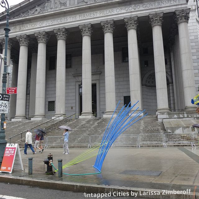 If you luck out with a hot Saturday, which we didn’t, then you’ll want to travel down to the Foley Square rest stop at Duane and Centre Street. CoolStop, designed by Chat Travieso, is a water mister prototype. Connected to a fire hydrant, dozens of blue PVC pipes curve up from the street and spray a fine mist over anyone in its radius. It’s a new school approach to the age old joy of releasing a fire hydrant and letting the water spring forth.