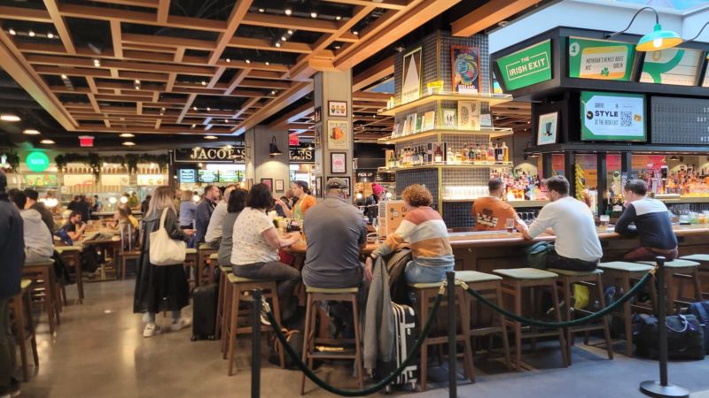 Irish Exit, from the owners of lower Manhattan’s beloved The Dead Rabbit, has an imposing presence in the Moynihan food hall and is always busy. Expect to pay close to $10 for a pint of the black stuff.