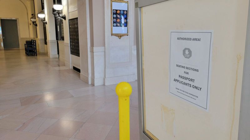 Moynihan occupies the former central post office building. The customer-facing portion of the post office still exists (through the entrance on Eighth Avenue) and offers a quiet respite from the cacophony inside the main hall. There is an alcove with chairs for passport applicants, which is empty when the office is closed. Stern signs warn the benches are off-limits, but we didn’t see anyone who would stop you from resting your feet.