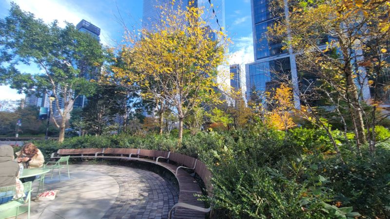 Seating: Bella Abzug Park has unsheltered public benches. This area is close to the Hudson River so it can feel considerably cooler.