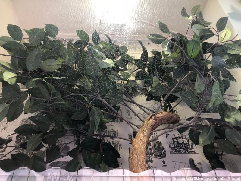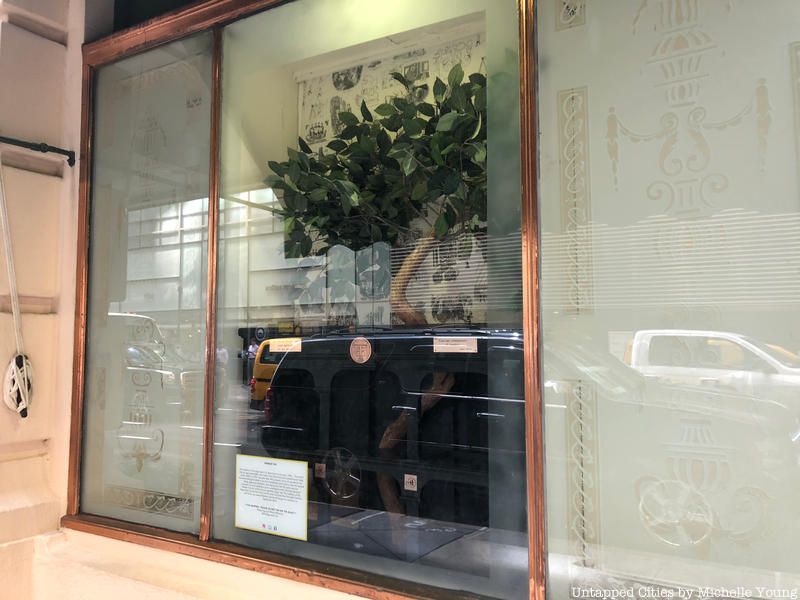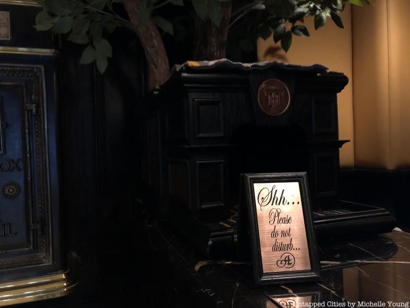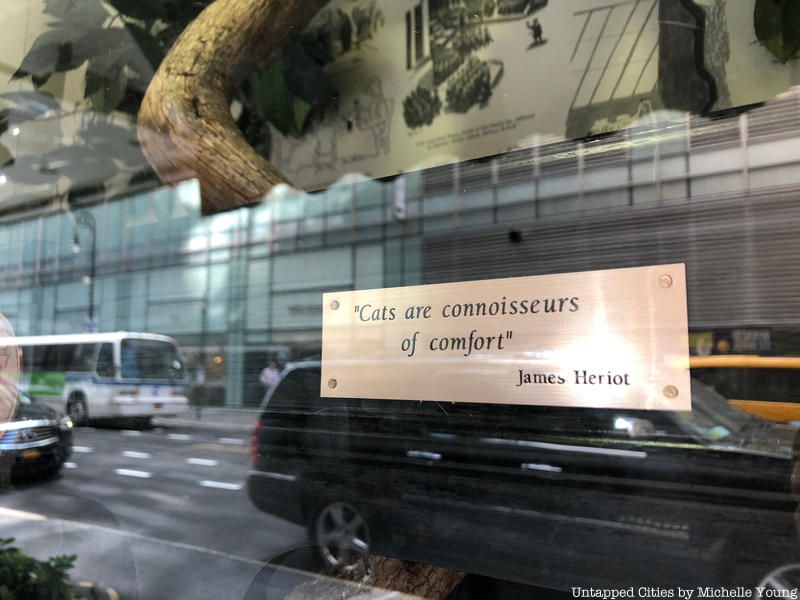 Hamlet has two fancy pet tree houses worthy of his name, one which sits at the end of the check in counter and one that is in one of the front windows of the hotel. A sign on the window says “ *** CAT NAPPING. PLEASE DO NOT TAP THE GLASS ***. The two level tree house has a bark trunk coming out and fake leaves and branches. There are several plaques affixed to the pet tree house, one with Hamlet’s name and the brand of the tree house (Pet Tree Houses), two with the Algonquin Hotel logo, and one with the quote “Cats are connoisseurs of comfort” from the veterinary surgeon and writer James Herriot (though the plaque has it misspelled as Heriot).