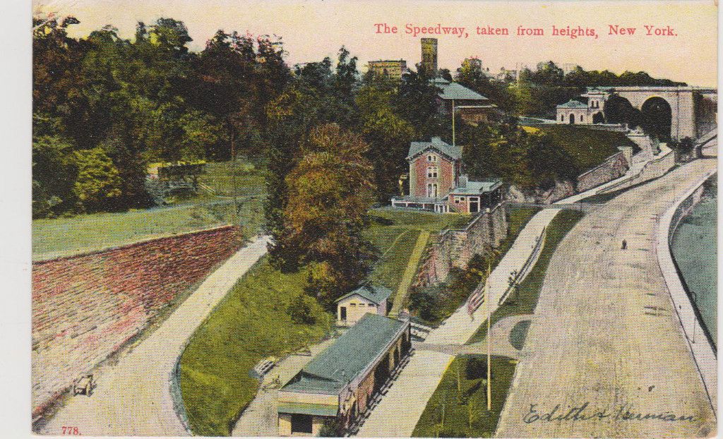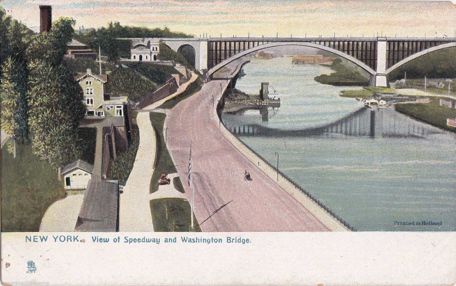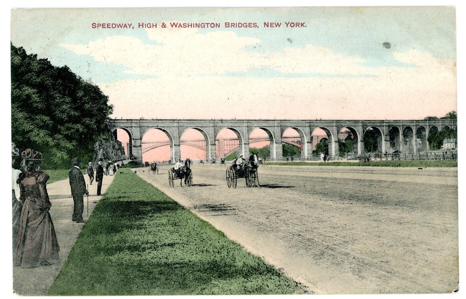 The Harlem River Speedway was a subject on the virtual talk we hosted, “The Forgotten Harlem River,” by photographers Nathan Kensinger and Duane Bailey-Castro. Bailey-Castro, a lifelong Bronx resident who has focused much of his work on the Harlem River bridges, showed these vintage postcards he had acquired and the short silent film below from 1903 entitled “Parade of Horses along the Speedway” from the American Mutoscope and Biograph Company.